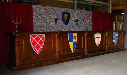 Dekoriert mit Ritterschildern und einer Rückwand